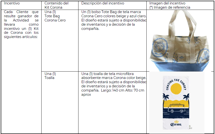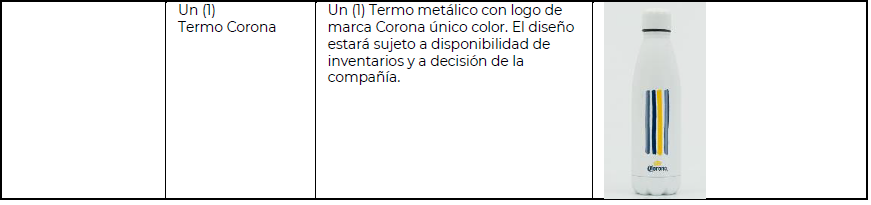 - Para mayor información sobre la promoción, condiciones y requisitos para la entrega de los premios y cantidad de premios disponibles, ingresar a https://www.corona.com/es/corona- extra-and-coronita y revisar los términos y condiciones o comunicarse en Bogotá al (601) 275 5505 y en el resto del país al 018000-526555