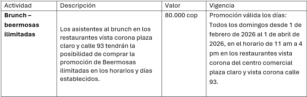 Localidad de Chapinero, Bogotá, Cundinamarca y Vista Corona Calle 93a #12-09, piso 11, Bogotá D.C Tendrá la siguiente actividad durante los domingos a partir del 1 de febrero de 2026 hasta el 1 de abril del 2026.