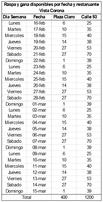 La actividad consiste en la entrega de un (1) raspa y gana por cada $150.000 COP de consumo en una sola factura (incluyendo impuestos y propina) en los restaurantes Vista Corona Calle 93 y Vista Corona Plaza Claro desde el lunes 16 de febrero hasta el domingo 15 de marzo. Serán 1.600 raspa y gana que estarán asignados por día de la siguiente forma:
